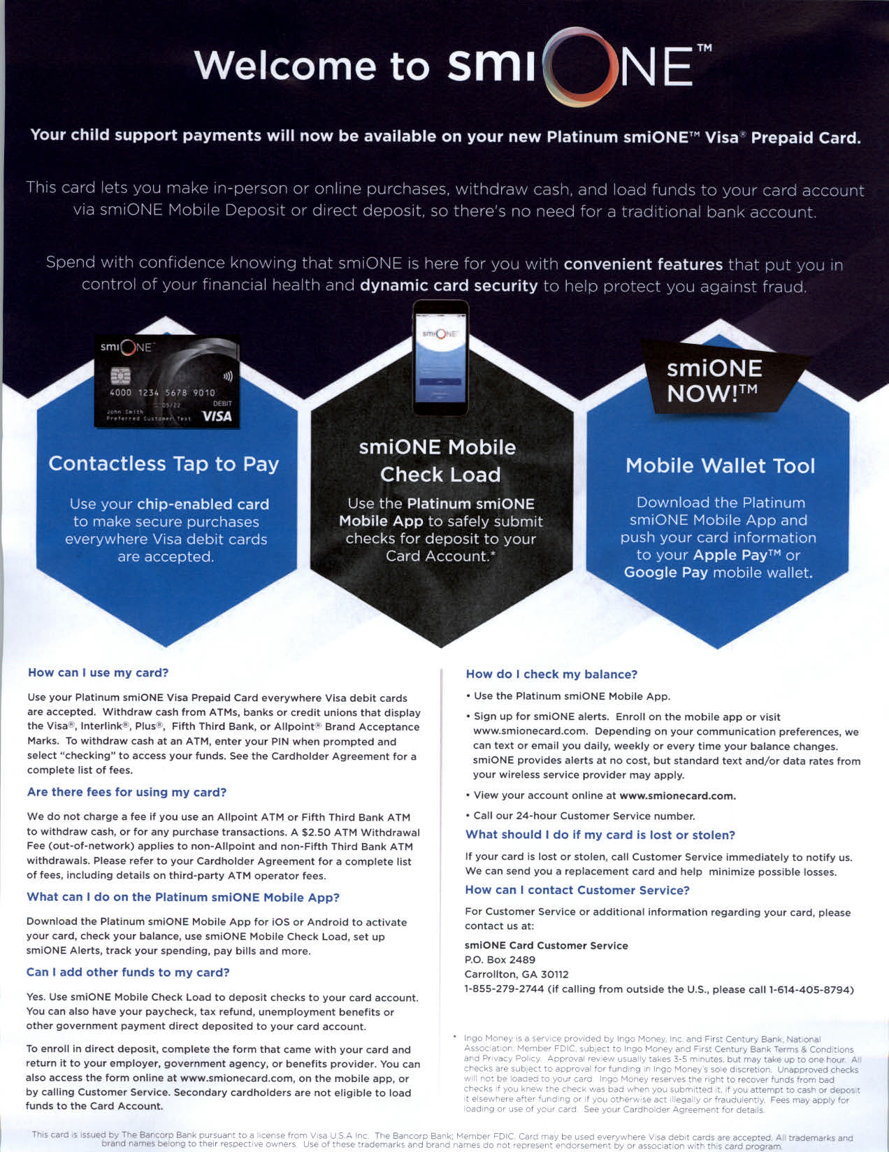 Custodial parents can enroll online for direct deposit or the smiONE card at https://oh.smartchildsupport.com or by calling Ohio Child Support Payment Central at 888-965-2676.